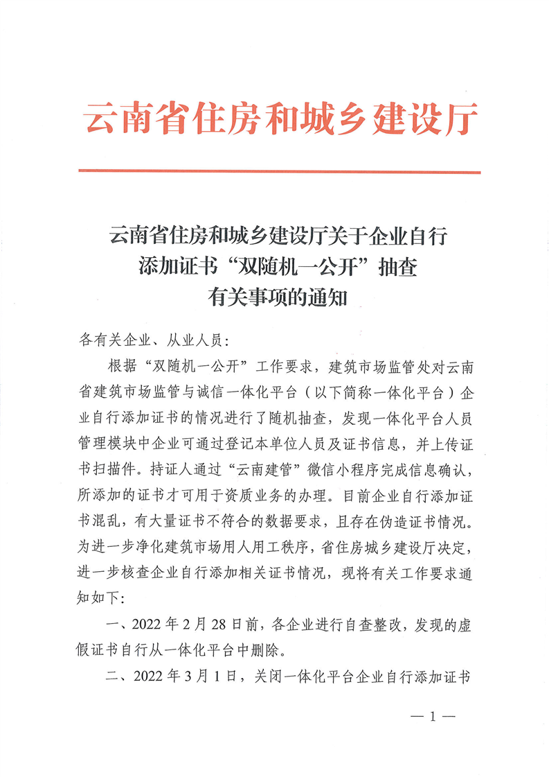 云南省住房和城鄉(xiāng)建設(shè)廳關(guān)于企業(yè)自行添加證書“雙隨機(jī)一公開(kāi)”抽查有關(guān)事項(xiàng)的通知